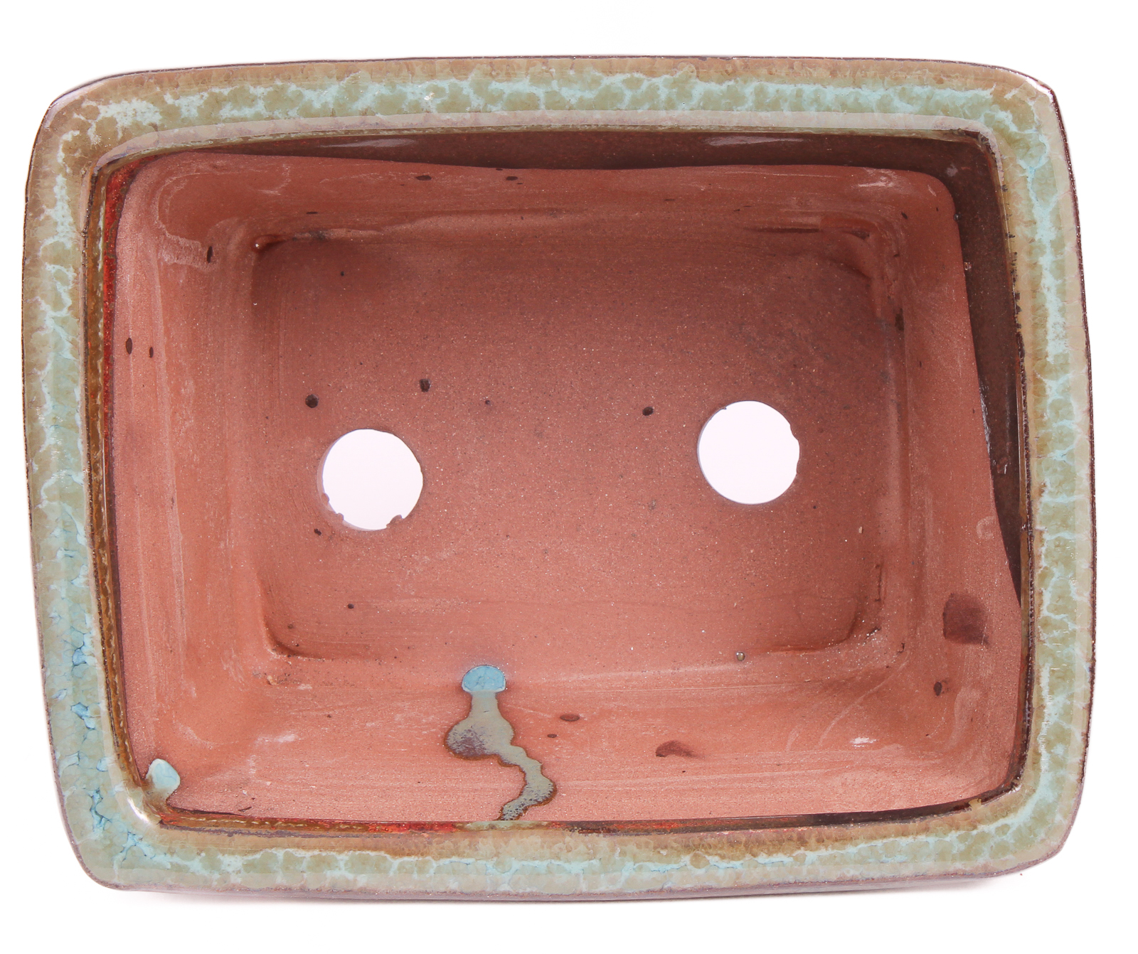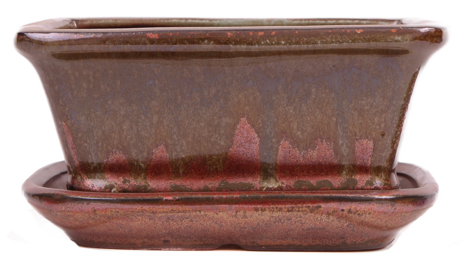 Eckige Bonsaischale - kupferfarben / grünbraun verlaufend glasiert - mit Untersetzer