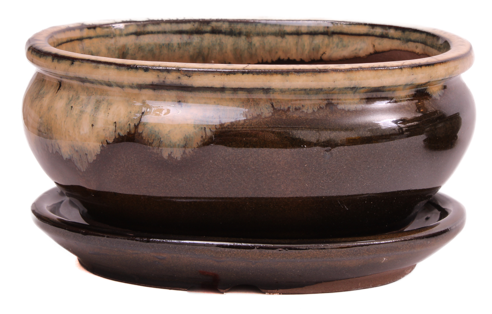 Ovale Bonsaischale - braun / beige verlaufend glasiert - mit Untersetzer