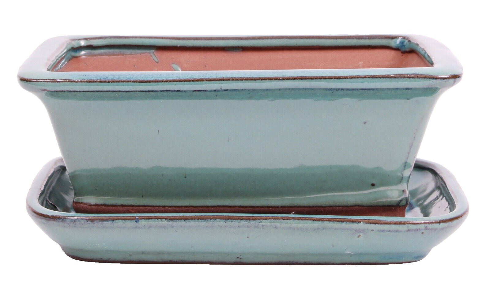 Eckige Bonsaischale - grün glasiert - mit Untersetzer