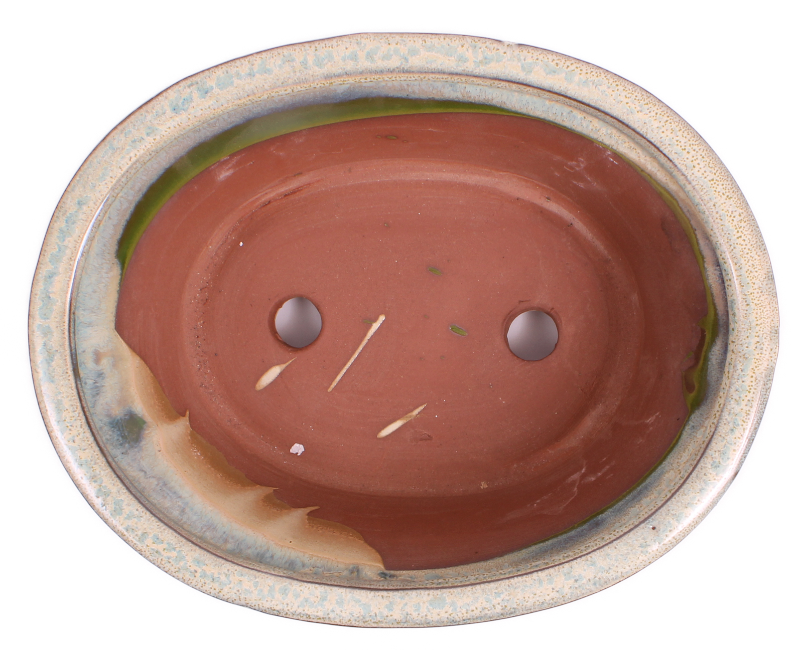 Ovale Bonsaischale - grün / beige verlaufend glasiert - mit Untersetzer