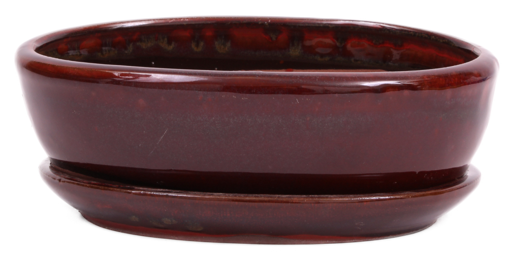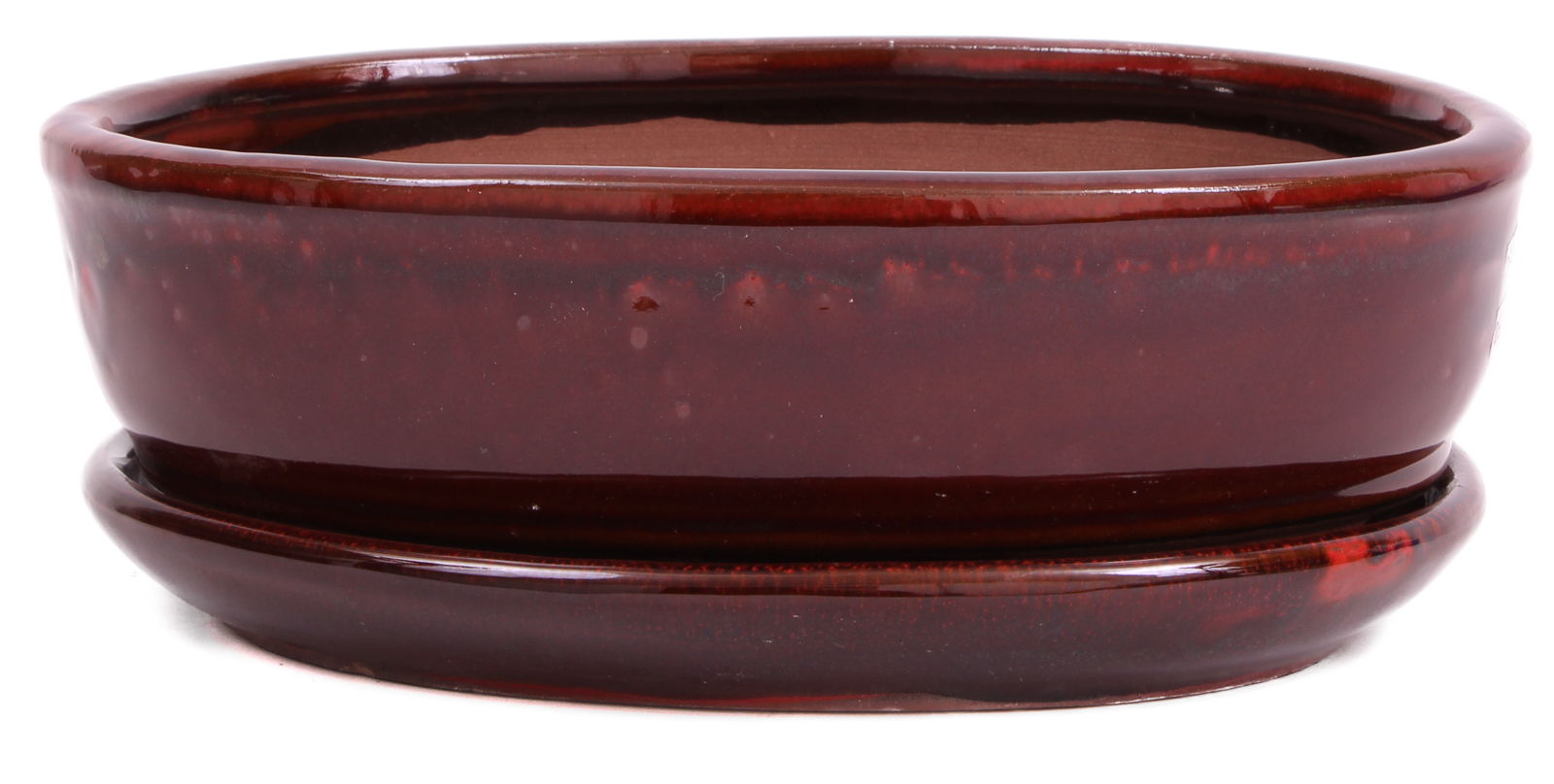 Ovale Bonsaischale - rotbraun verlaufend glasiert - mit Untersetzer