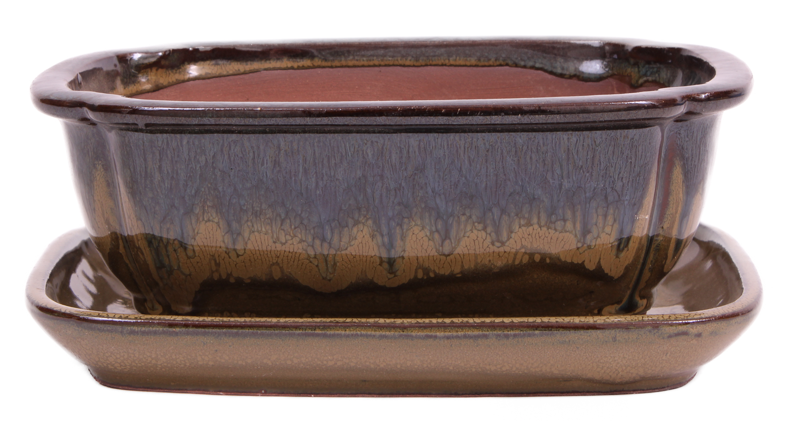 Eckige Bonsaischale - grünblau / beige verlaufend glasiert - mit Untersetzer