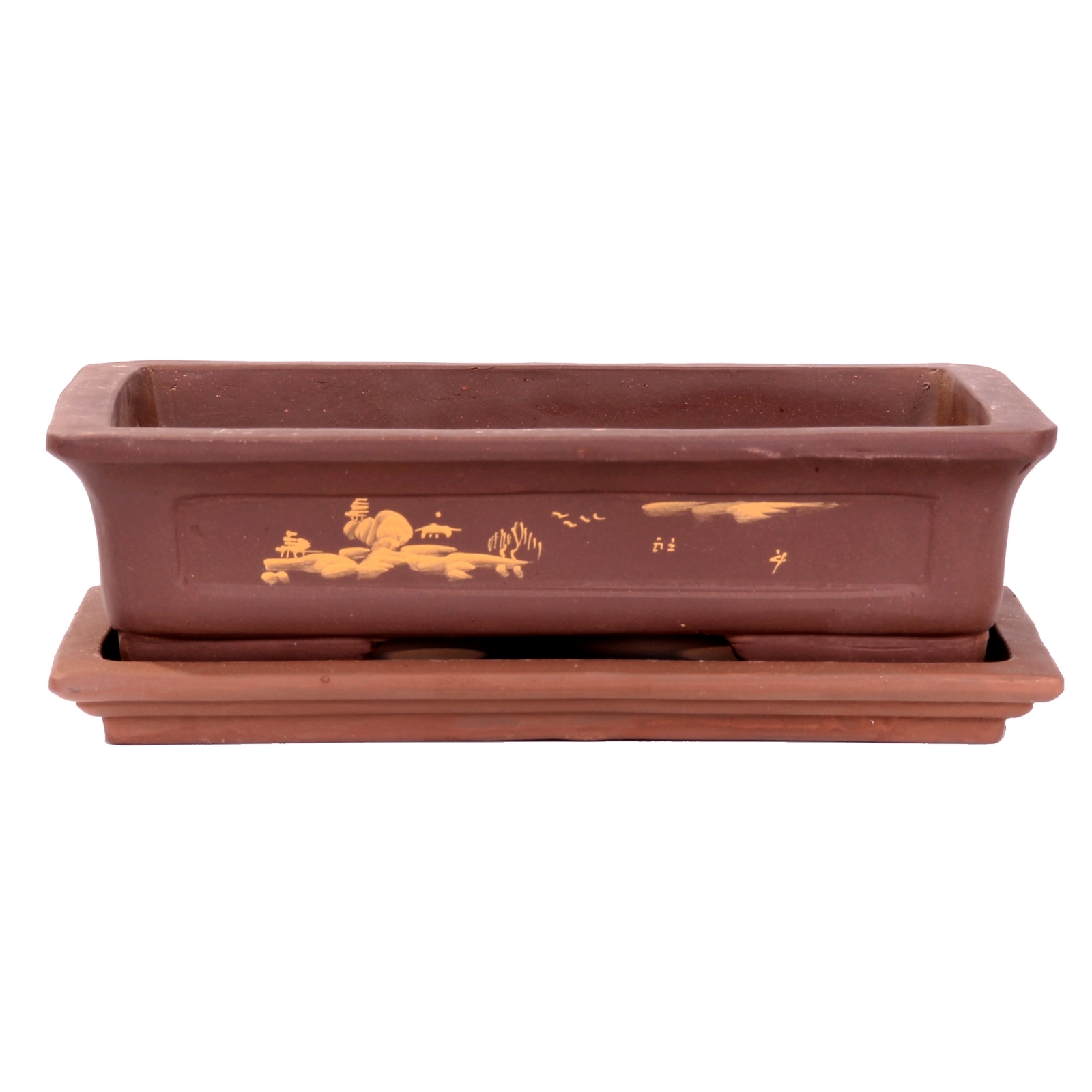 Bonsai-Schale mit Untersetzer 30 x 21,5 x 8 cm, mit Motiv auf Vorderseite , braun, eckig, unglasiert