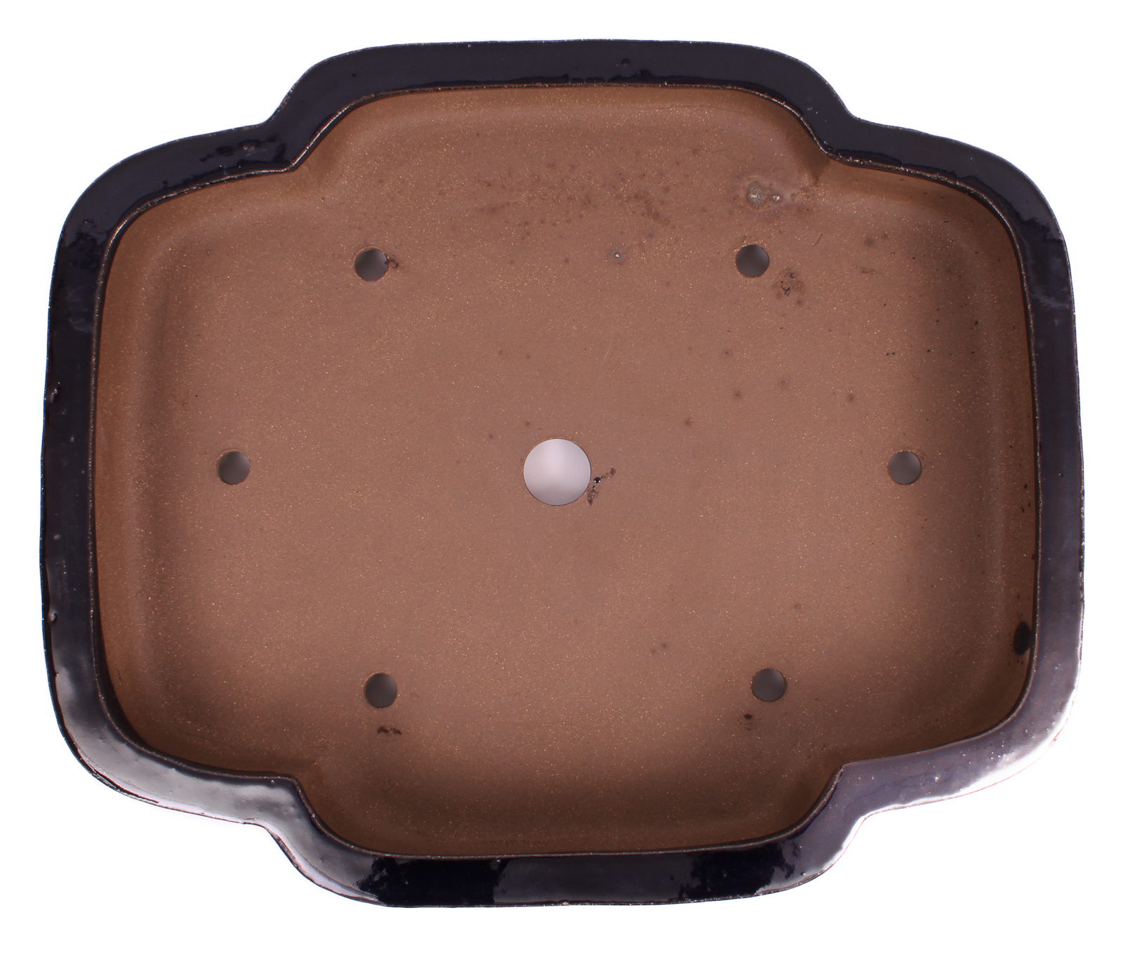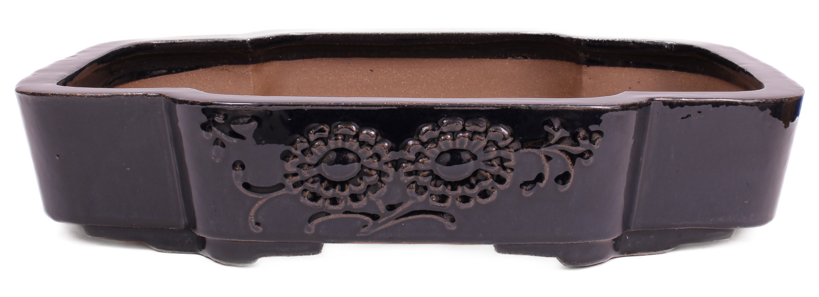 Eckige Bonsaischale dunkelblau glasiert mit floralem Relief - frostfest