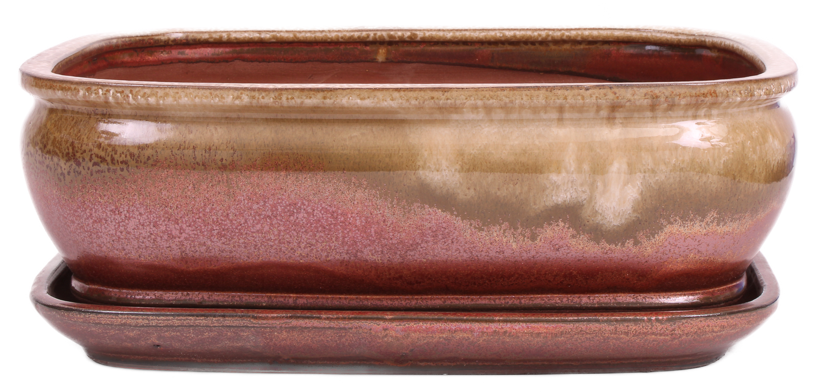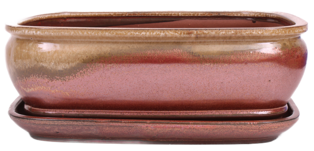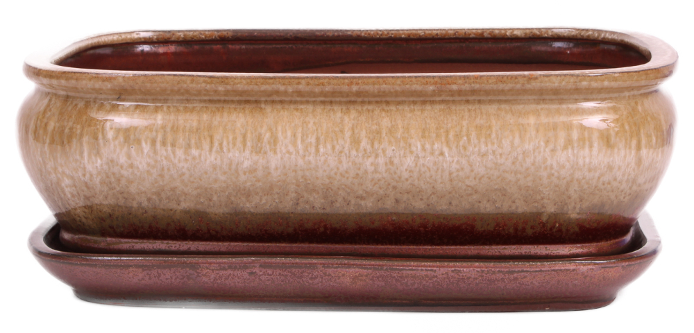 Eckige Bonsaischale - beige / kupfer verlaufend glasiert - mit Untersetzer