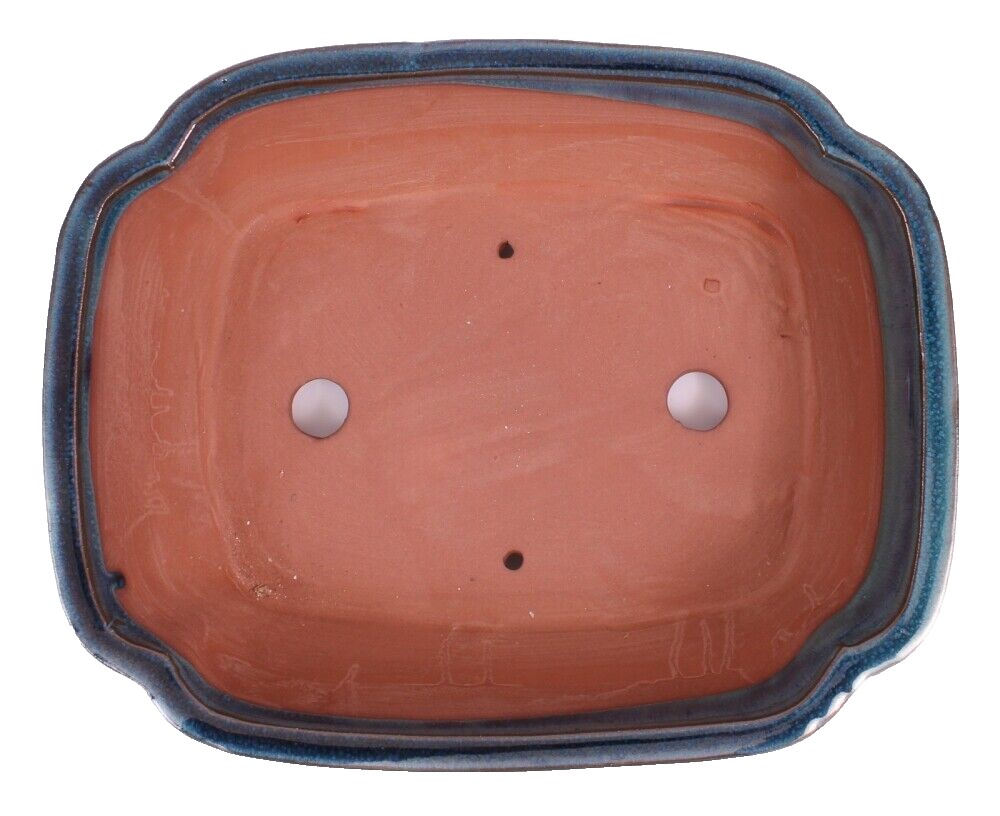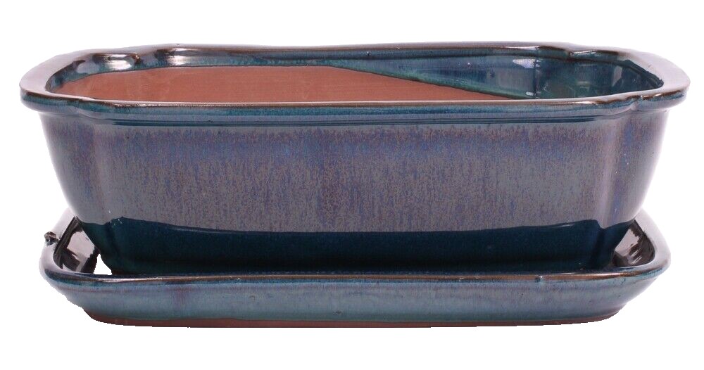 Ovale Bonsaischale, grünblau glasiert, mit Untersetzer