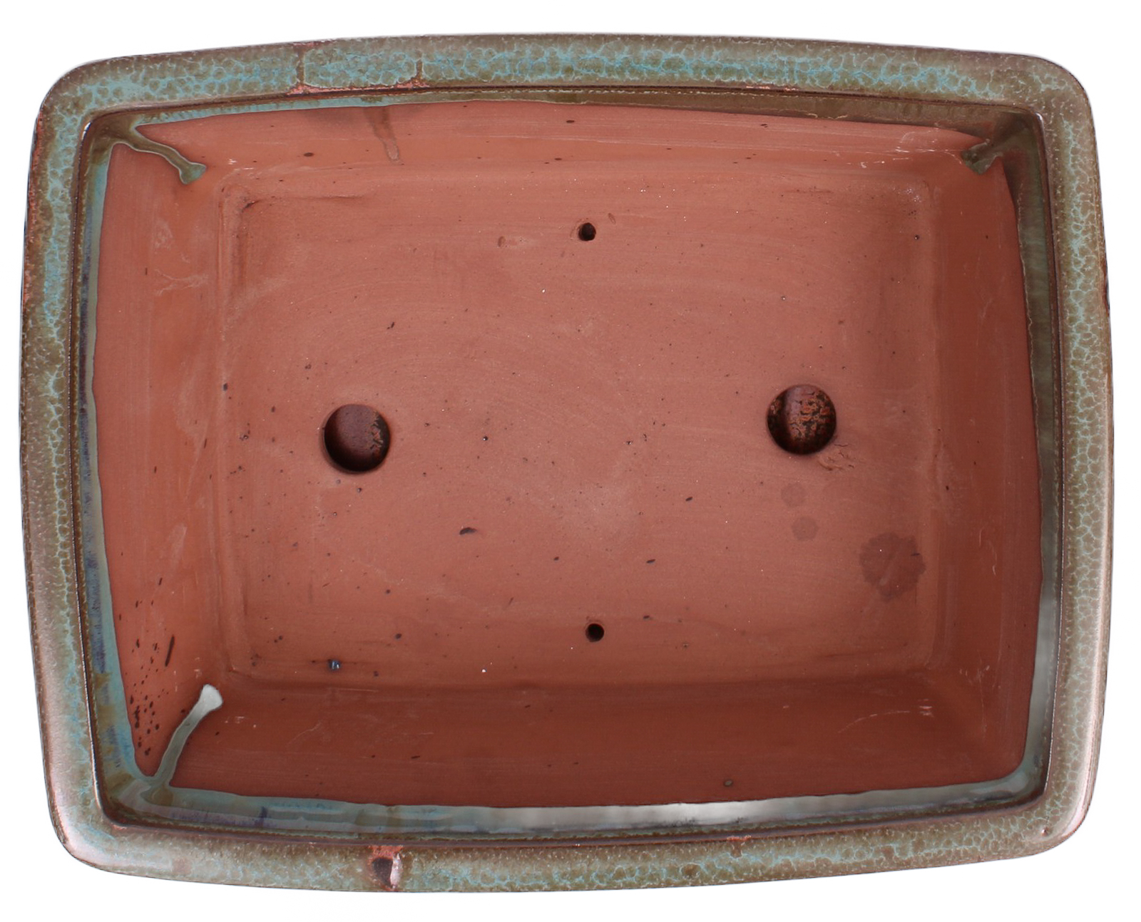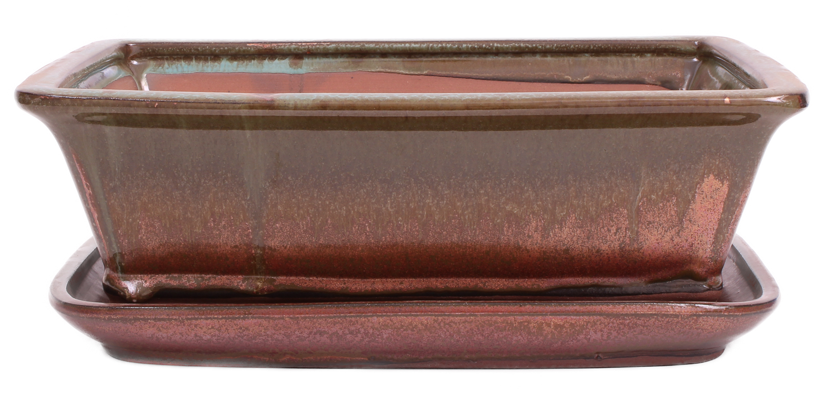 Eckige Bonsaischale - grün / kupfer verlaufend glasiert - mit Untersetzer