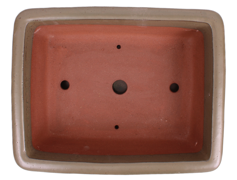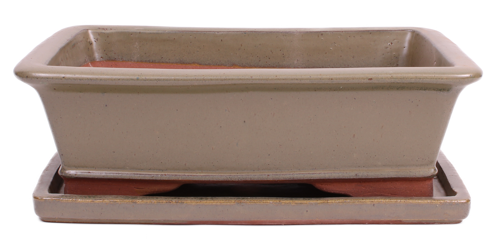 Eckige Bonsaischale, olivfarben glasiert, mit Untersetzer