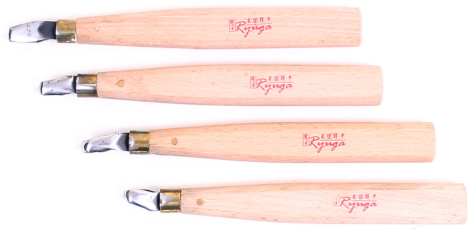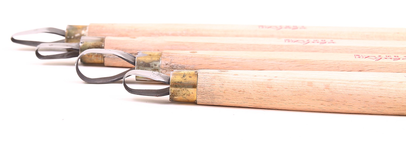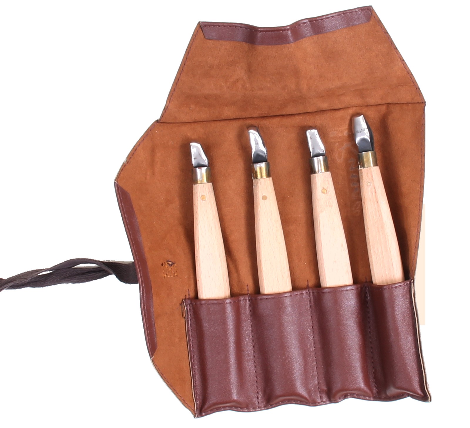 Das Set besteht aus vier verschiedenen Schlaufenmessern zur präzisen Bearbeitung von Holzfasern und Rindenpartien.