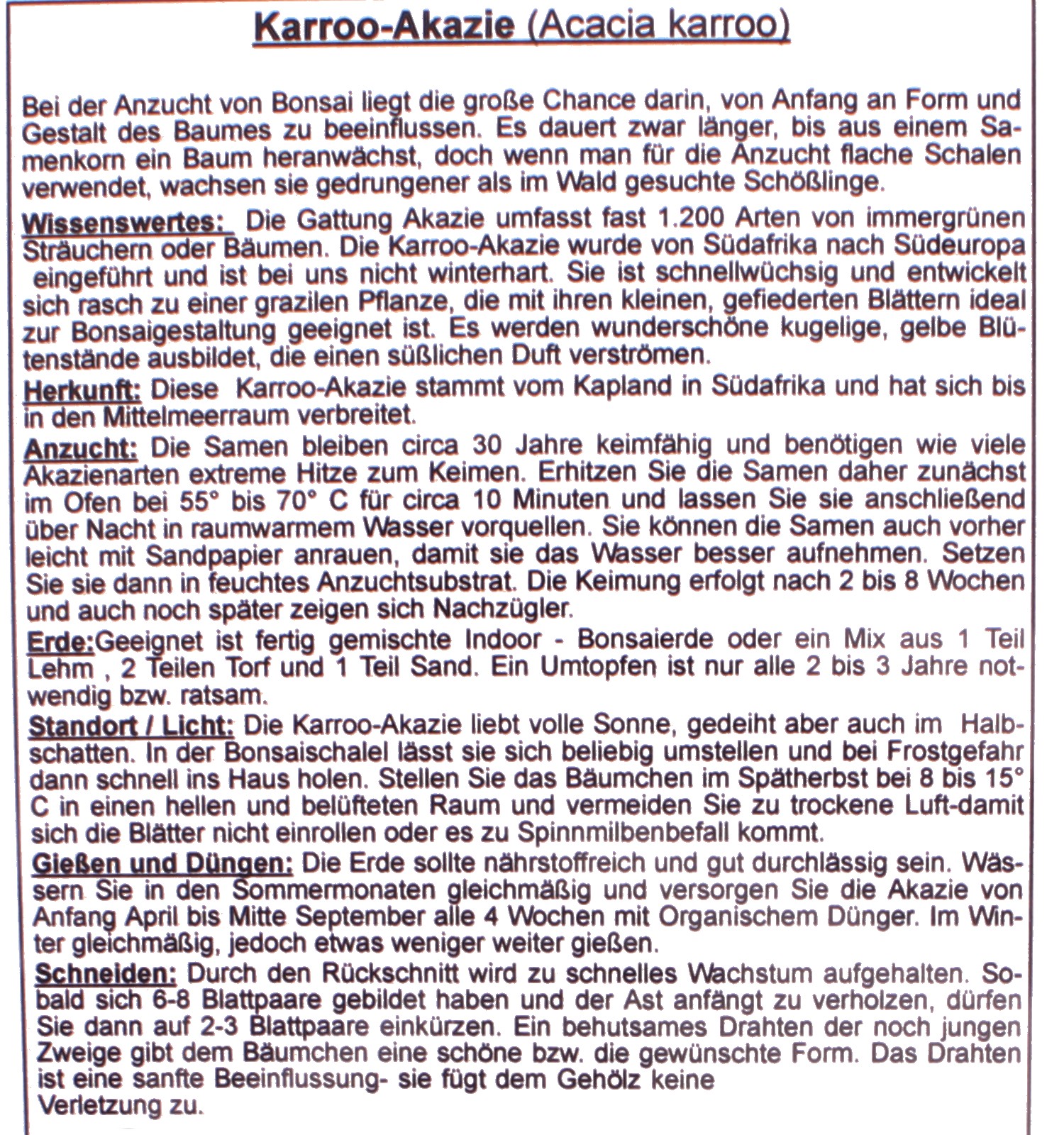 - Die Karroo-Akazie ist schnellwüchsig und eignet sich mit ihren feinen, gefiederten Blättern ideal für die Bonsaigestaltung.