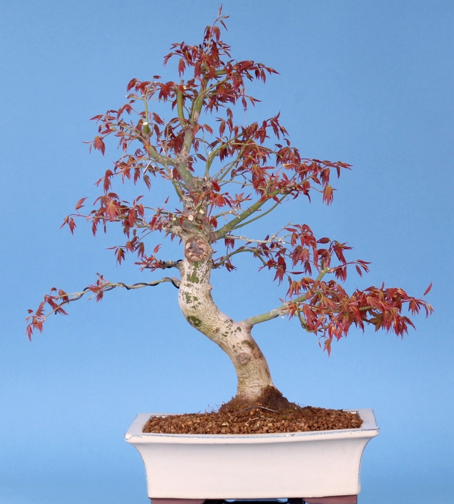 Gestaltung möglichst nur durch beschneiden, da Draht beim Ahorn sehr schnell einwächst. Wenn Draht nötig ist, nicht länger als 2 Monate am Baum belassen. Dickere Äste abspannen und den Draht abpolstern.
