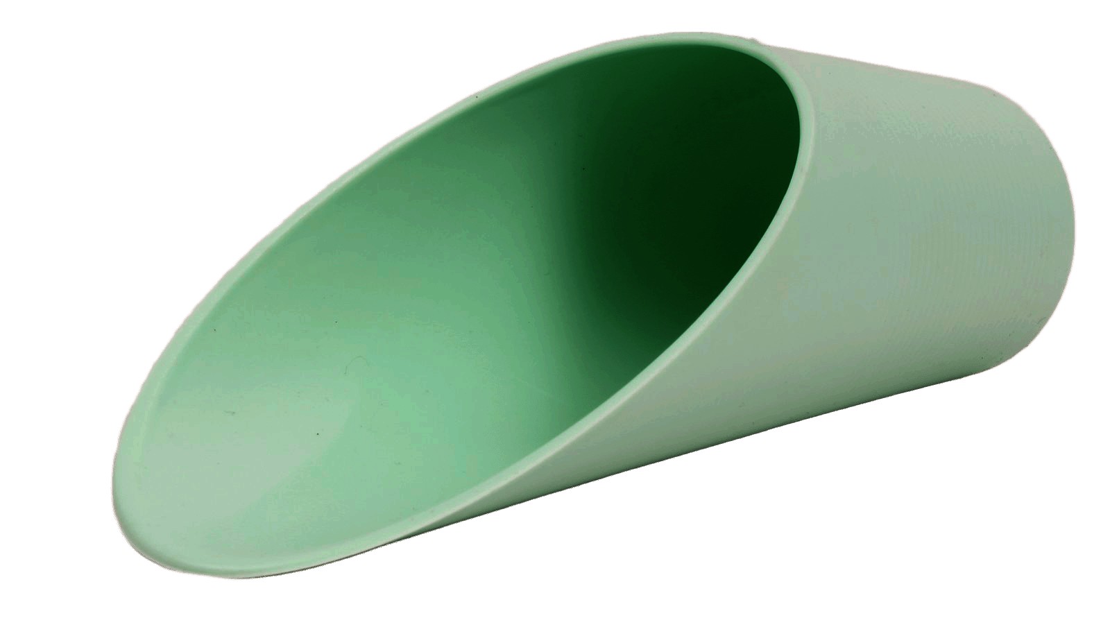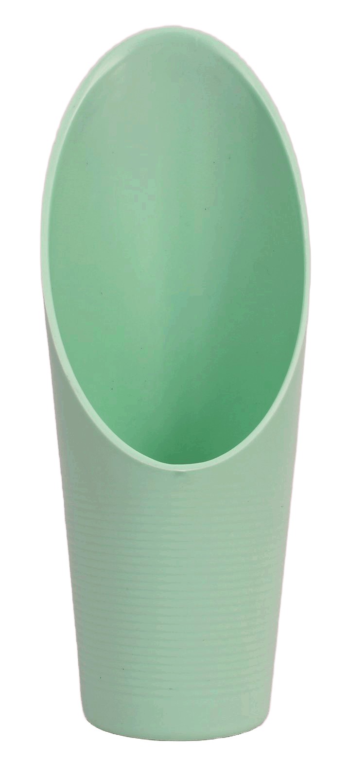 Die Erdschaufel aus hellgrünem Kunststoff ist ein praktisches Hilfswerkzeug zum Einfüllen und Verteilen von Substraten beim Umtopfen von Bonsai.