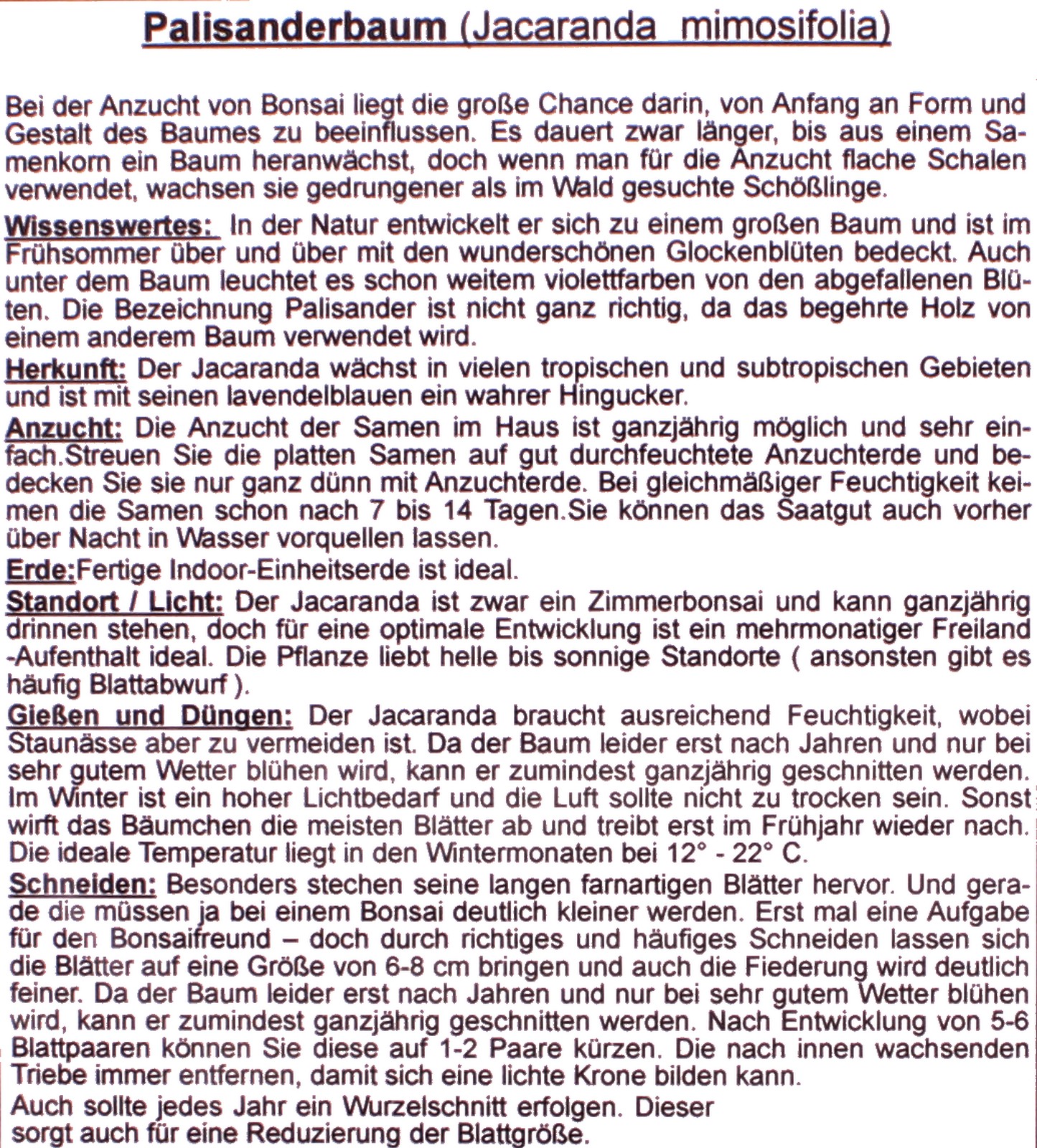Hinweis: Die charakteristischen Blüten erscheinen erst nach einigen Jahren und nur bei idealen Bedingungen – doch das elegante Blattwerk macht den Jacaranda schon vorher zu einem außergewöhnlichen Bonsai!