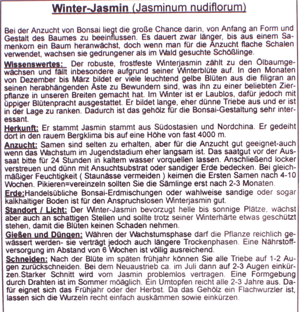 - Im Winter ist er laublos, dafür mit üppiger Blütenpracht geschmückt. Seine langen, dünnen, rankenden Triebe machen ihn für die Bonsai-Gestaltung interessant.