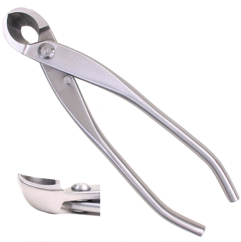 Die Dingmu Bonsai-Konkavzange 180 mm mit gebogener Schneide aus Edelstahl ist ein präzises Werkzeug für detailgenaue Schnittarbeiten.