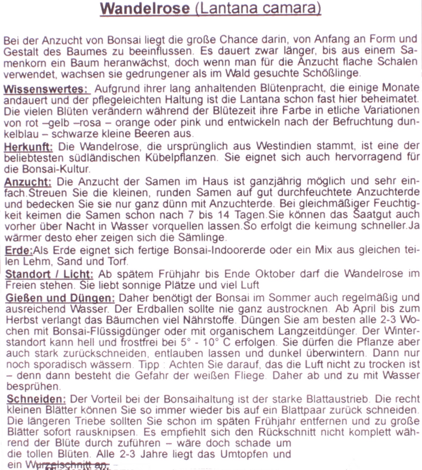 Dank ihrer Robustheit und einfachen Pflege fühlt sich die ursprünglich aus Westindien stammende Pflanze inzwischen auch bei uns fast heimisch. Die Lantana zählt zu den beliebtesten mediterranen Kübelpflanzen und eignet sich auch hervorragend für die Bonsai-Kultur.