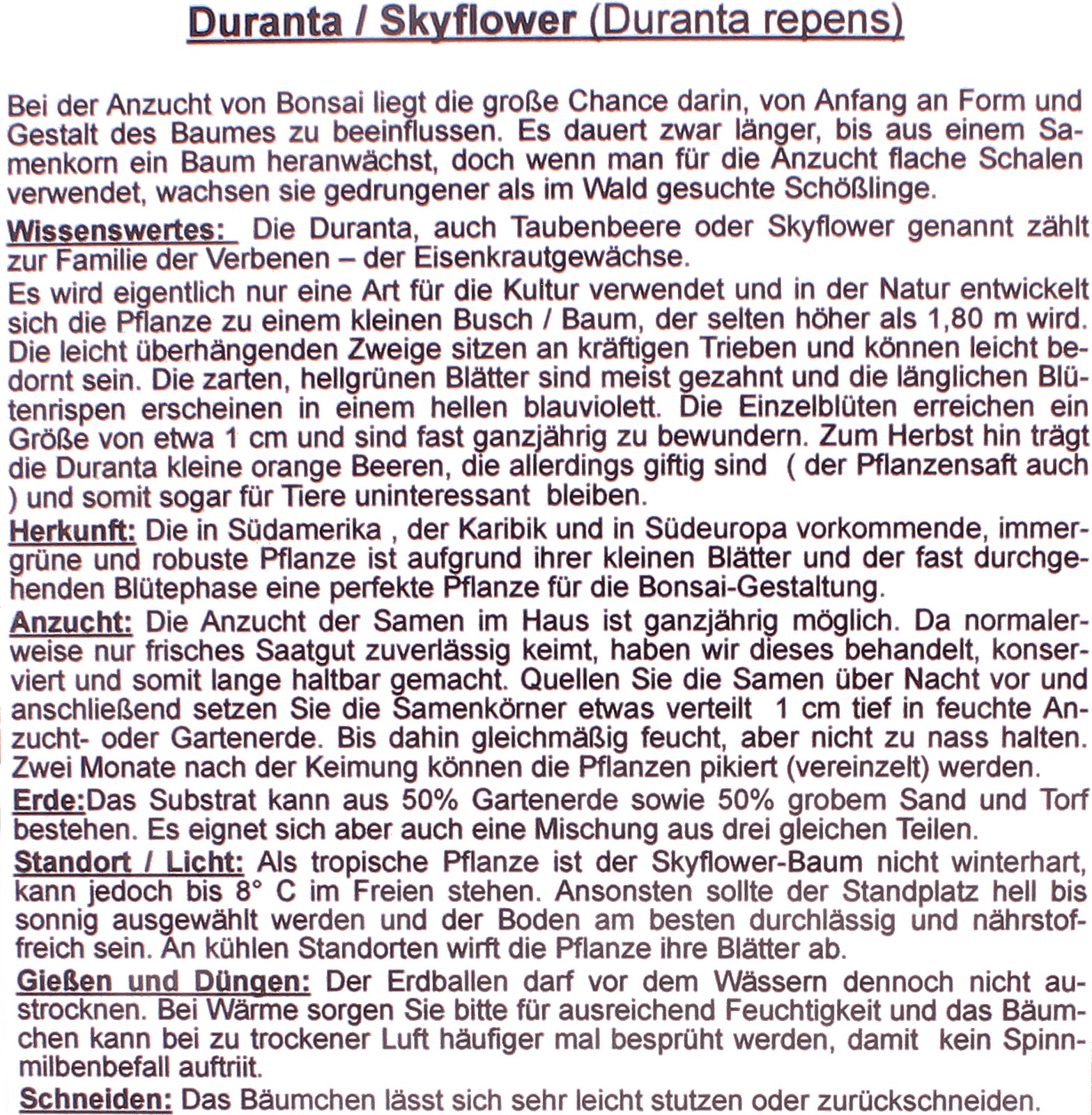 Die Duranta, auch bekannt als Taubenbeere oder Skyflower, ist eine tropische Pflanze aus der Familie der Eisenkrautgewächse (Verbenaceae). Sie eignet sich hervorragend für die Bonsai-Gestaltung und begeistert durch ihre zarte Erscheinung und nahezu ganzjährige Blüte.