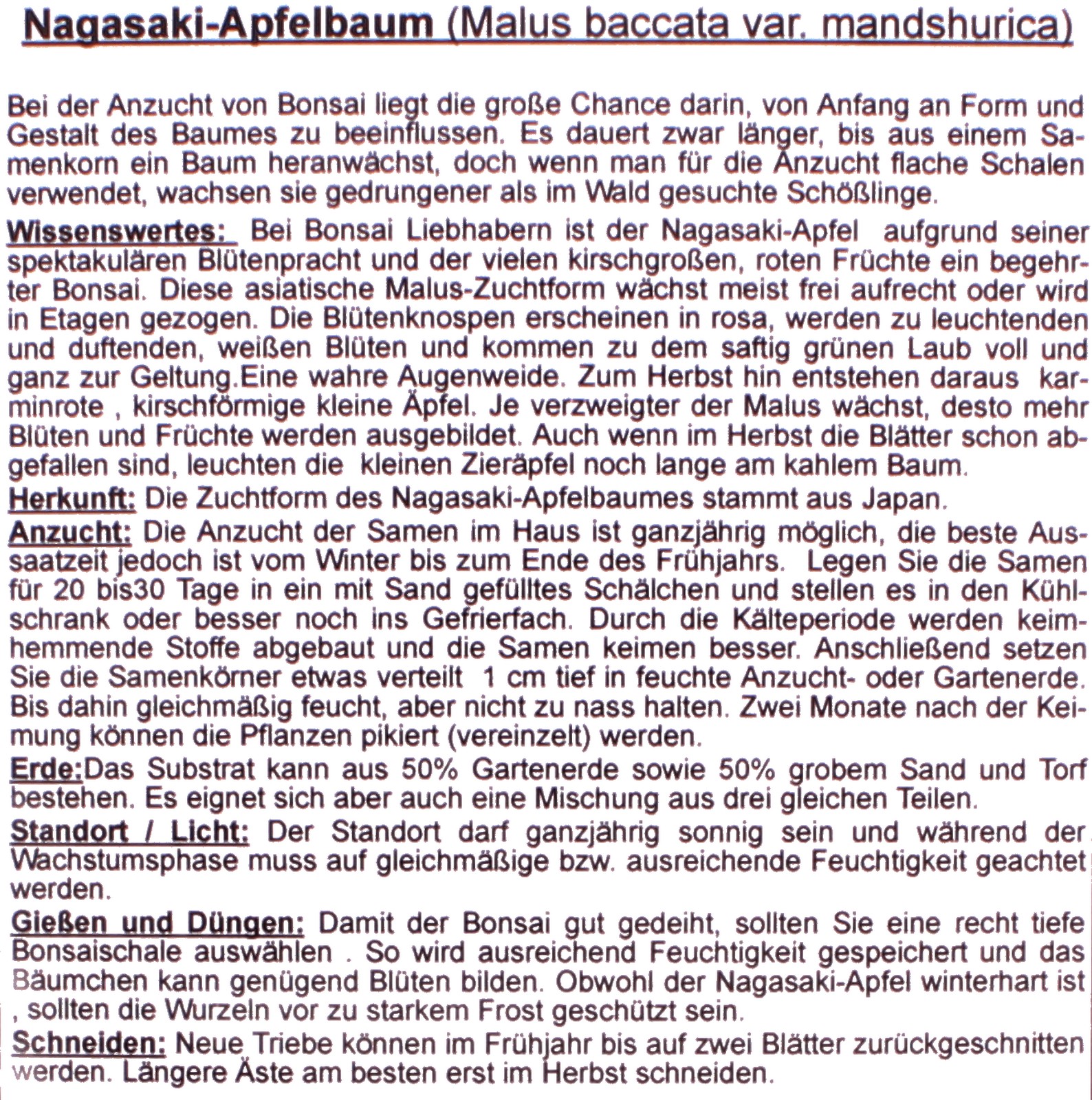 Zuchtform aus Japan, basierend auf dem sibirischen Wildapfel (Malus baccata). Sehr beliebt in der Bonsai-Kultur, auch für Freilandhaltung geeignet.