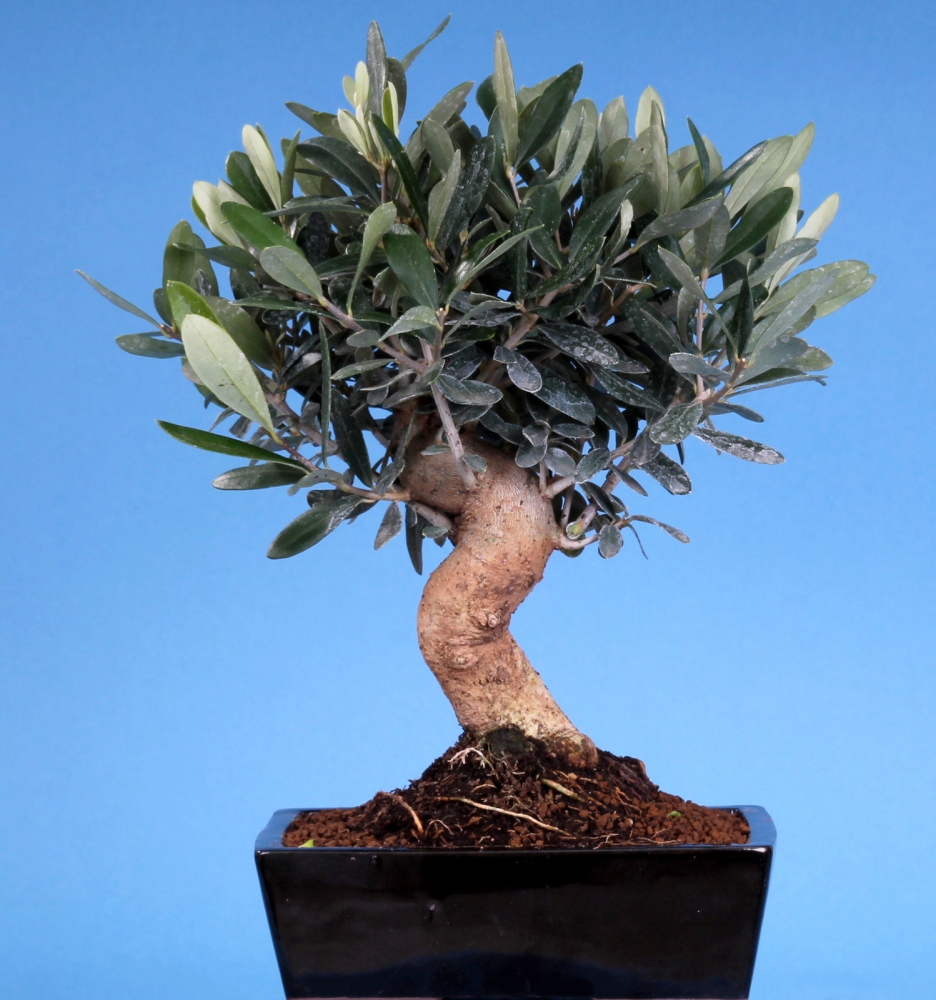 Die meisten Oliven im Handel sind Zuchtformen mit etwas größeren Blättern. Die Wildolive (Olea europaea 'Sylvestris') hat deutlich kleinere Blätter und ist deshalb als Bonsai besonders beliebt.