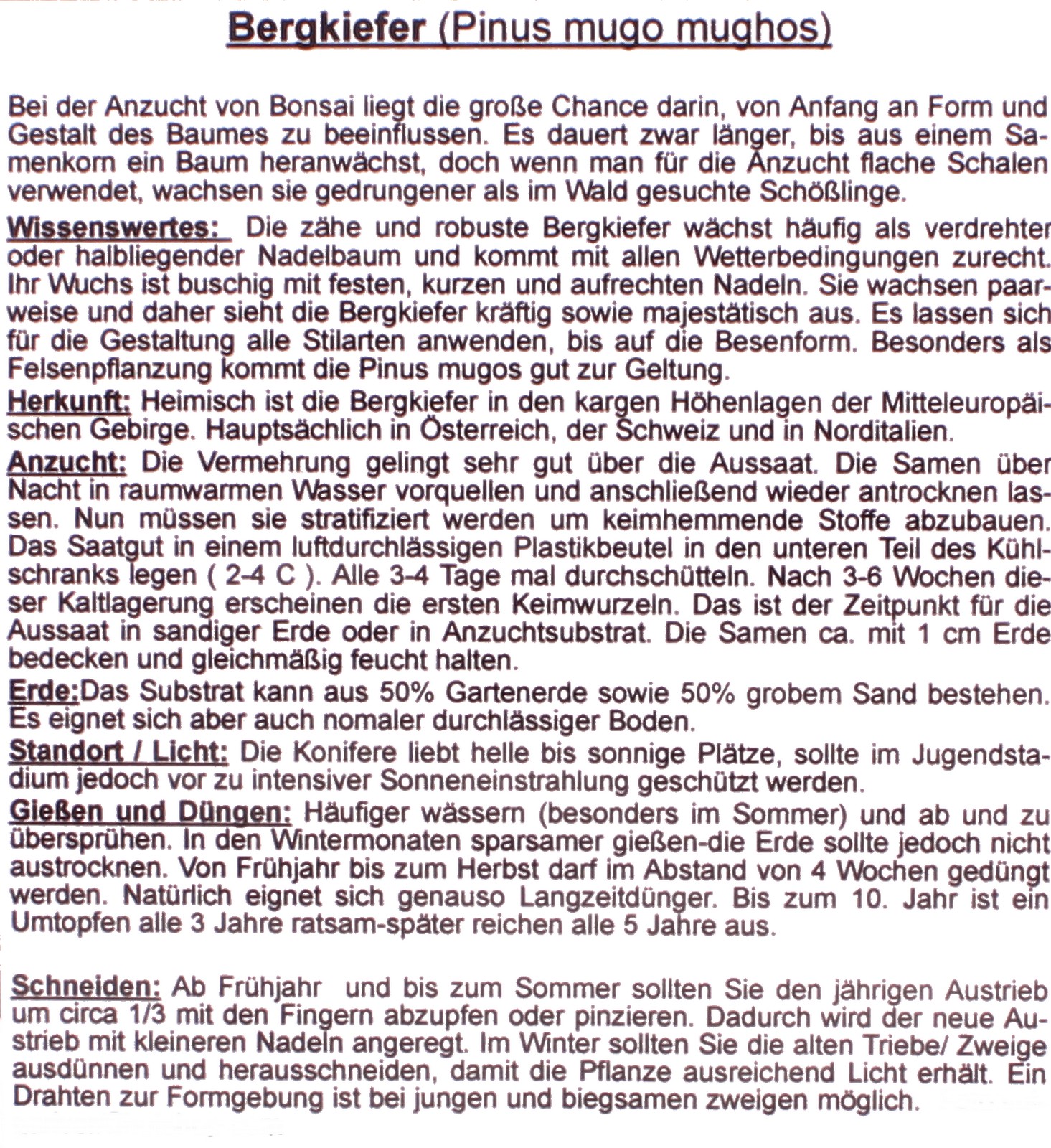 Die Bergkiefer ist eine zähe und widerstandsfähige Konifere, die sich hervorragend als Bonsai eignet. In der Natur wächst sie oft verdreht oder halbliegend und beeindruckt durch ihren buschigen Wuchs mit festen, kurzen Nadeln. Diese stehen paarweise und verleihen der Bergkiefer ein kräftiges, majestätisches Erscheinungsbild.