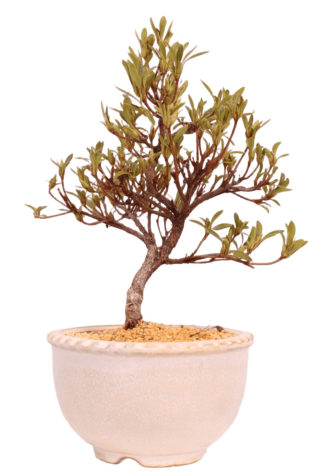 Dekorativer Bonsai der Art Satsuki Azalee (Rhododendron indicum) aus Japan. Diese beliebte Bonsai-Art überzeugt durch ihre feine Verzweigung und ihre saisonale Blütenpracht. Die kompakte Wuchsform eignet sich ideal für die Gestaltung auf kleinem Raum.